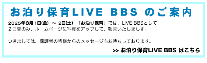 - 2025年8月2日2025年8月1日(金)〜2日(土)、 「お泊り保育LIVE BBS」を終了いたしました。
