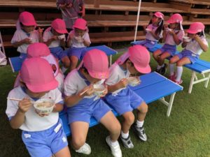 雨が上がったのでもう一度外でお泊り保育の旗揚式を行いました。